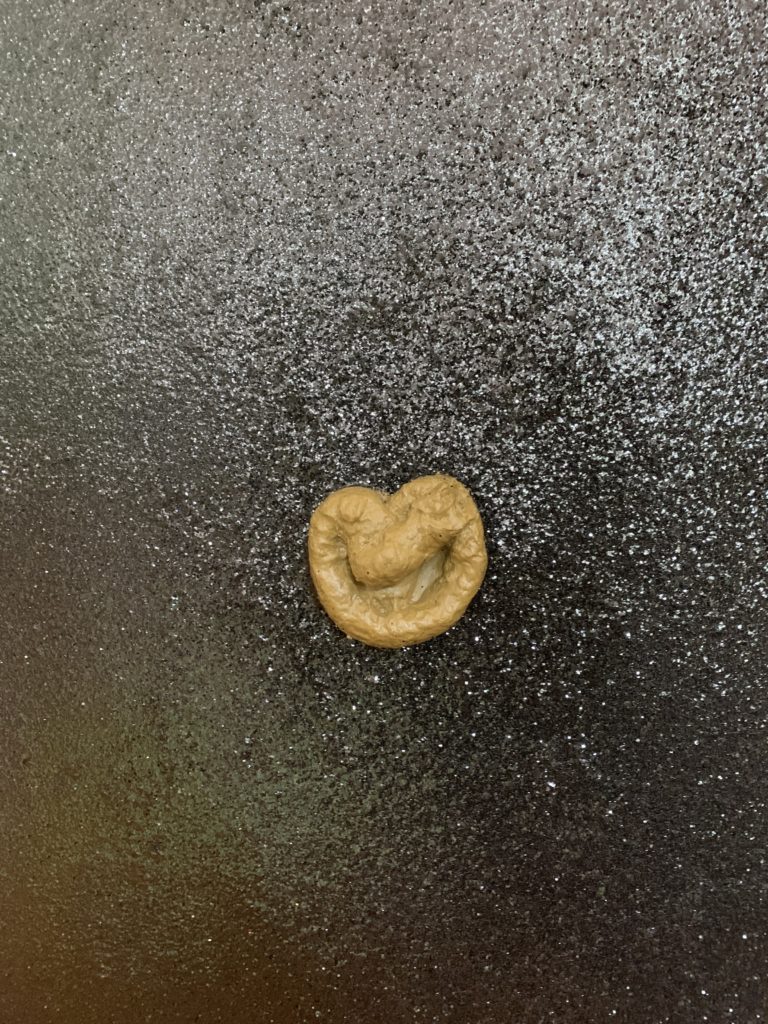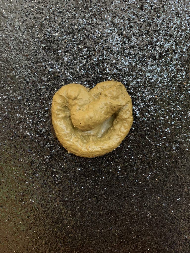 Tout porte donc à croire que les fèces sont des espèces sans substance, inassimilables à toute transsubstantiation marchande. C’est pourquoi l’acte de la défécation reste isolé et caché dans la Société du Spectacle où les fesses s’exhibent. Tout un dispositif d’interdictions comportementales et langagières nous dérobe la vue du faire caca. En l’exposant, Cédric Fargues nous dévoile la dimension religieuse de la merde : le caca n’a pas de valeur d’usage ni d’échange mais il a une valeur d’exposition et cette valeur d’exposition désigne la merde comme le dieu caché de la Société du Spectacle.