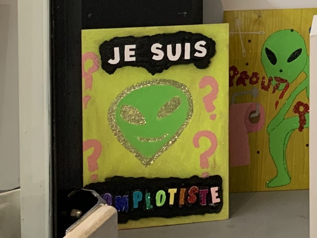 Les œuvres de Cédric Fargues proviennent de l’enfance de l’art, de la pratique d’un jeu perpétuel, comme nous le donne à entendre ce jeu de mots duchampien : « Ils sont extra tes restes ». Alien Caca dénonce la pensée simulacre de l’enfance, celle qui brosse l’opinion dans le sens des poils, la pensée « Bisounours ». Penser à contre sens des poils, c’est se faire « complotiste ».